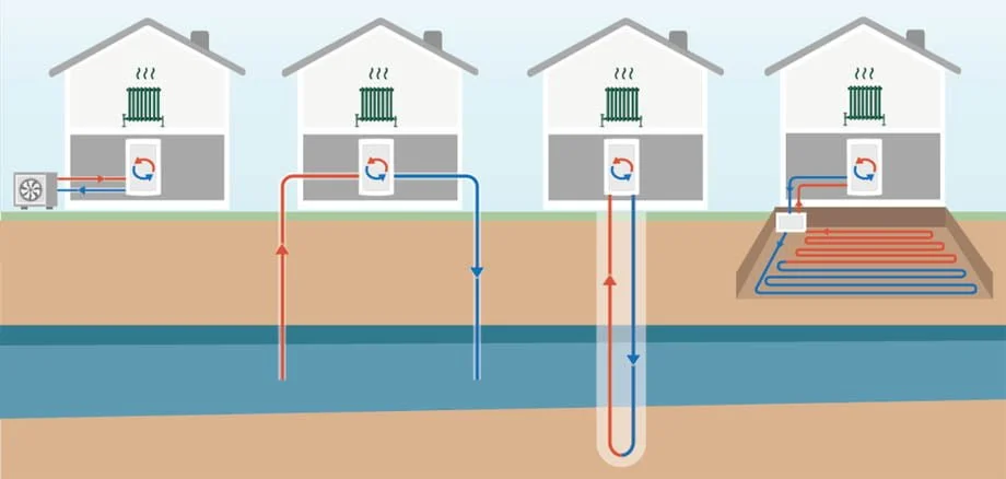 Različni sistemi ogrevanja na elektriko s toplotnimi črpalkami: toplotna črpalka zrak-voda, toplotna črpalka voda-voda, geotermalna toplotna črpalka (geosonda) in geotermalna toplotna črpalka zemlja-voda.