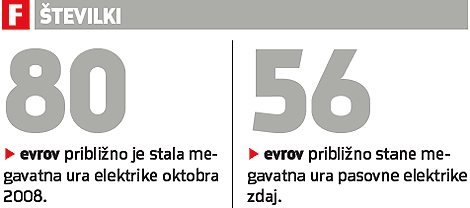 Leta 2008 so podjetja elektriko zakupovala za leto 2009 po ceni med 80 in sto evri za megavatno uro, zdaj je cena elektrike v pasu okoli 56 evrov za megavatno uro, če jo kupite za leto 2012. To pomeni, da je cena za povprečno podjetje, ki večino elektrike porabi med delavniki in čez dan, okoli 65 evrov za megavatno uro, pravijo sogovorniki, ki ne želijo biti imenovani.