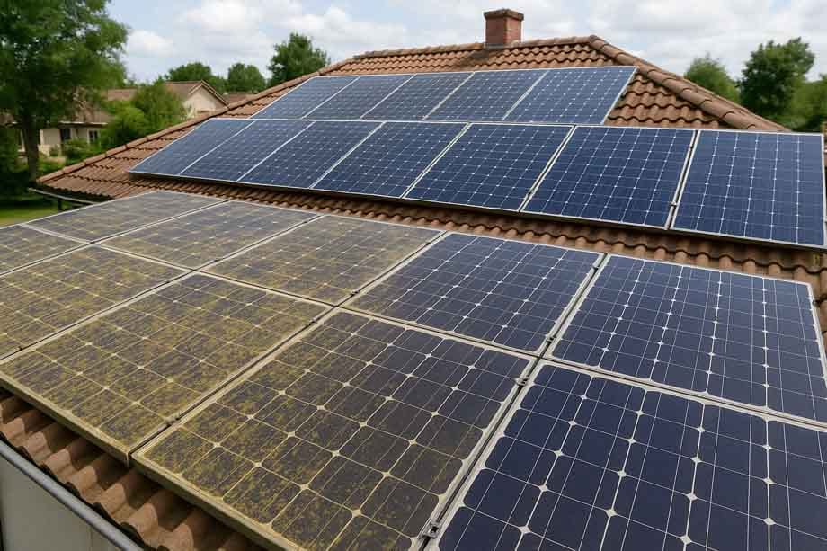Nečiščeni solarni paneli lahko izgubijo velik del učinkovitosti – na sliki je jasno vidna razlika med umazanimi in čistimi moduli.
