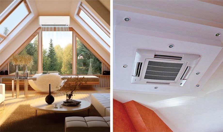 Montaža klimatske naprave v mansardi – montirajte jo čim višje, če imamo ravni strop, lahko izberemo tudi kasetno stropno klimatsko napravo.