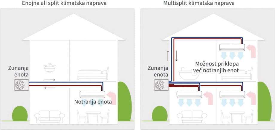 Grafični prikaz delovanja enojne klimatske naprave (levo) in multisplit sistema z večimi notranjimi enotami (desno).