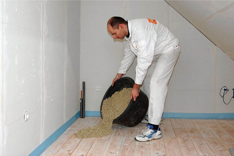 Če pa obnavljamo nosilna tla iz lesene konstrukcije, moramo pred nasutjem položiti paroprepustno folijo in polepiti stike, da preprečimo uhajanje granul skozi morebitne razpoke.