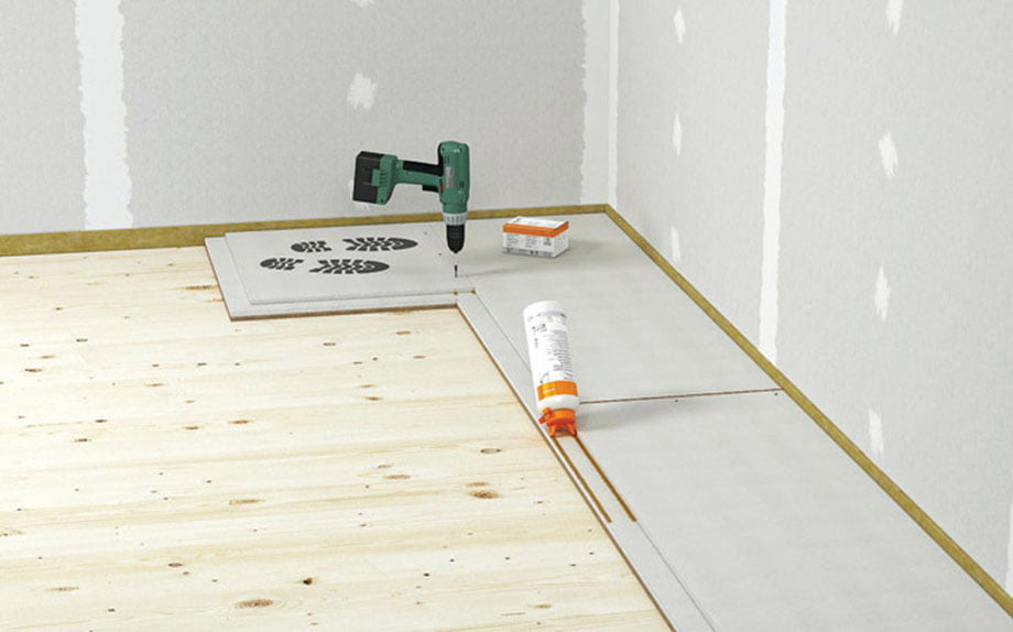 V kopalnici in kuhinji, kjer je možnost, da tla pridejo v stik z vodo, je treba izbrati vodoodporne plošče, na primer cementne, kot so na primer Fermacell Powerpanel TE ali wedi plošče.