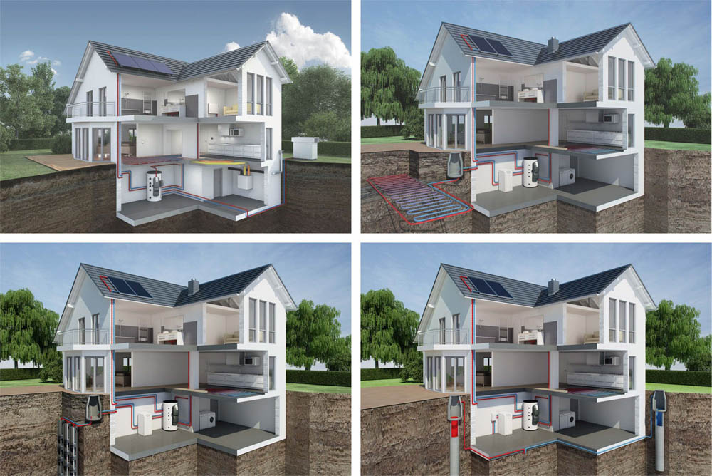 Toplotne črpalke lahko prestrezajo različne vire energije: energijo iz zunanjega zraka (sistem zrak-voda), energijo podtalne vode (sistem voda-voda) ali energijo zemlje (sistem zemlja-voda ali geosonda).
